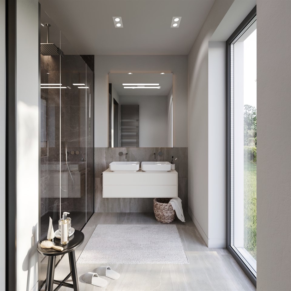 W budynku zostały zaprojektowane trzy sypialnie z wyjściem na taras, salon połączony z przeszklonym aneksem kuchennym oraz wyjściem na przestronny ok. 20m2 taras + ogród, łazienka wraz z toaletą i oknem, przedpokój, druga toaleta, pralnio-kotłownia oraz garaż.